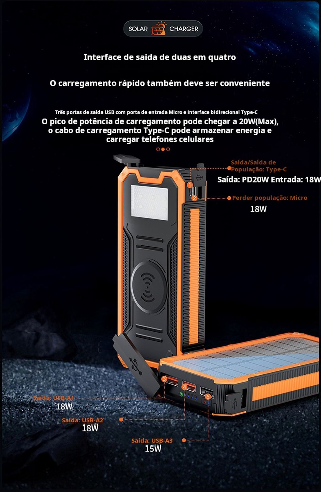 Carregador solar portátil de 30000mAh - Carregador rápido com portas USB-C e duplas, compatível com iPhone, Samsung e outros dispositivos, painel solar à prova de água para campismo, trilhos e utilização no exterior.