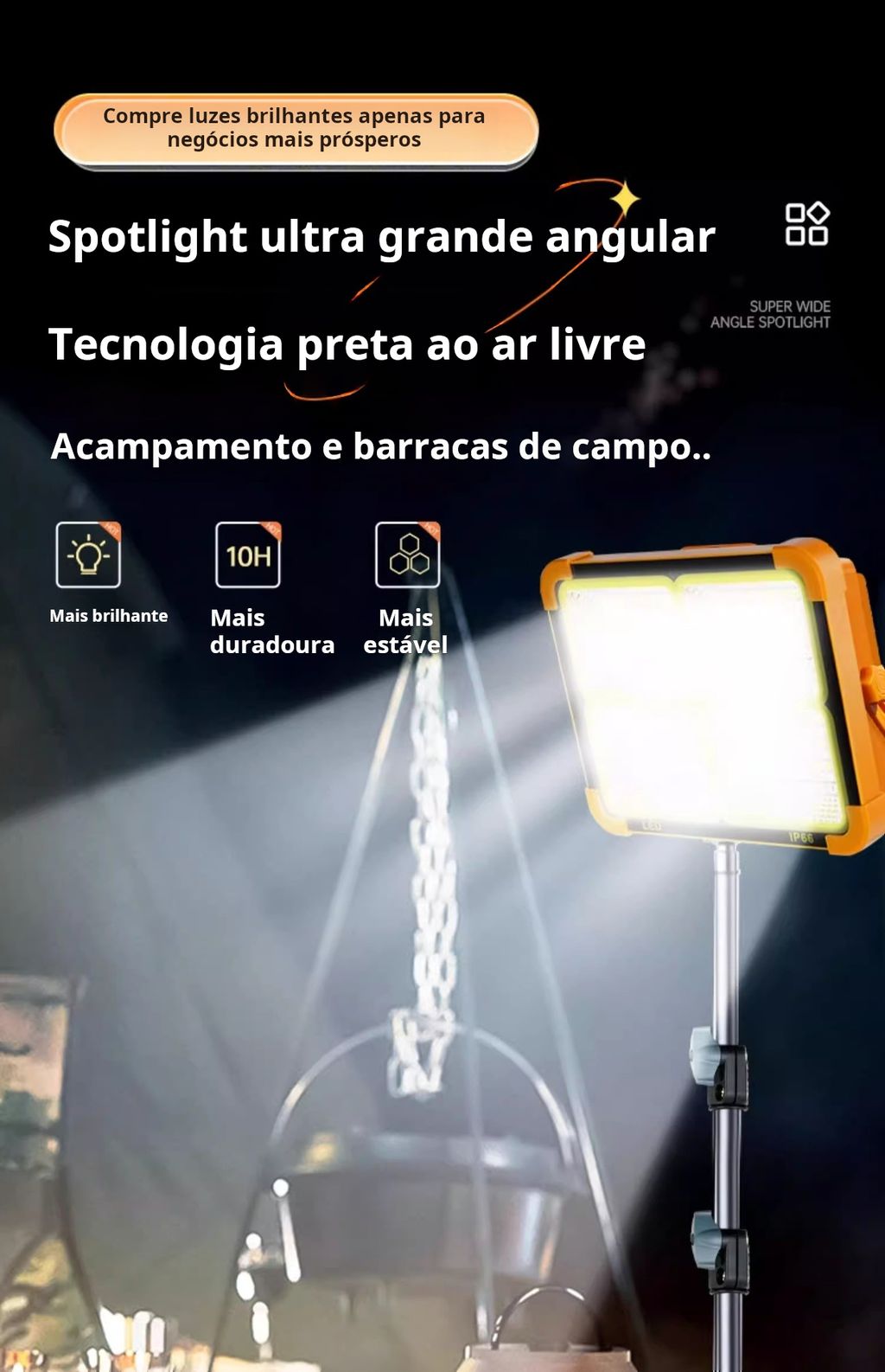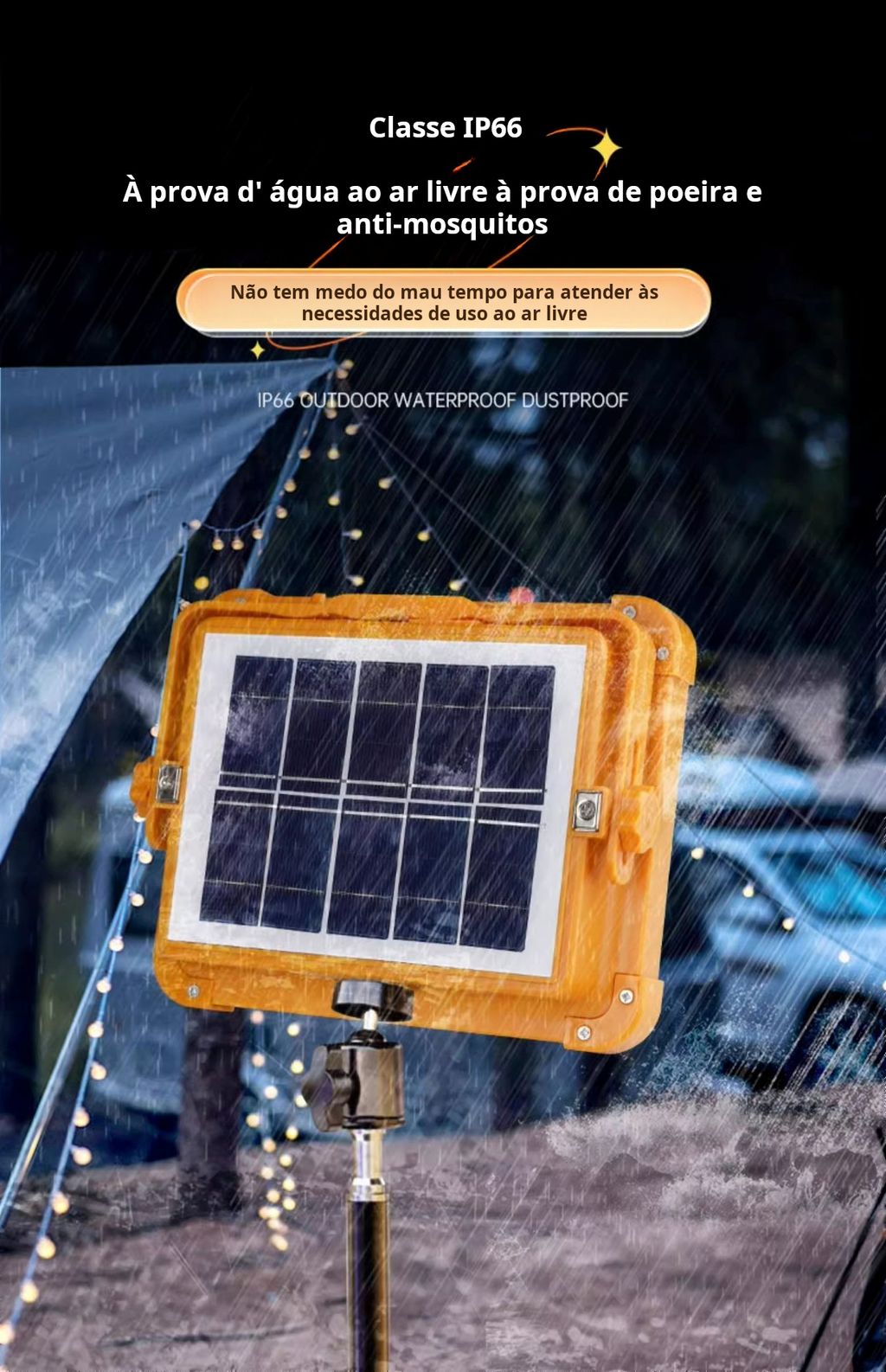 Lanterna de trabalho recarregável por energia solar de 120 W, 144 LEDs, 10.000 lúmens, portátil, com suporte, à prova de água IP66, 4 modos de iluminação, ideal para mecânicos, campismo, pesca e reparações automóveis.