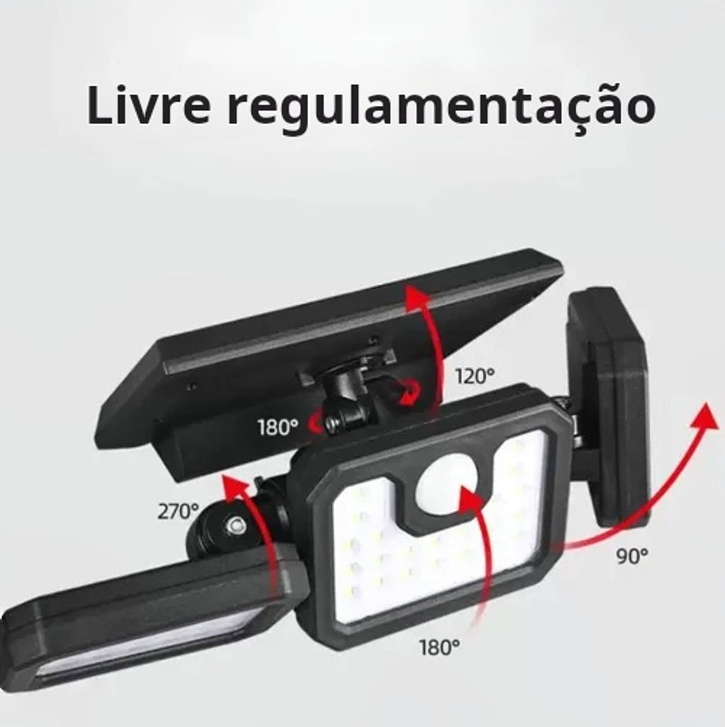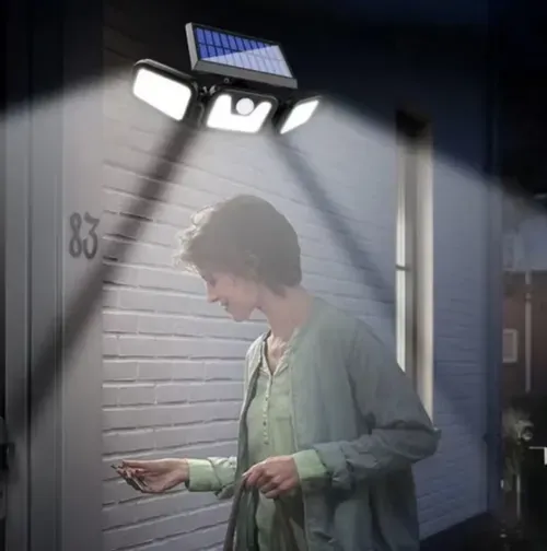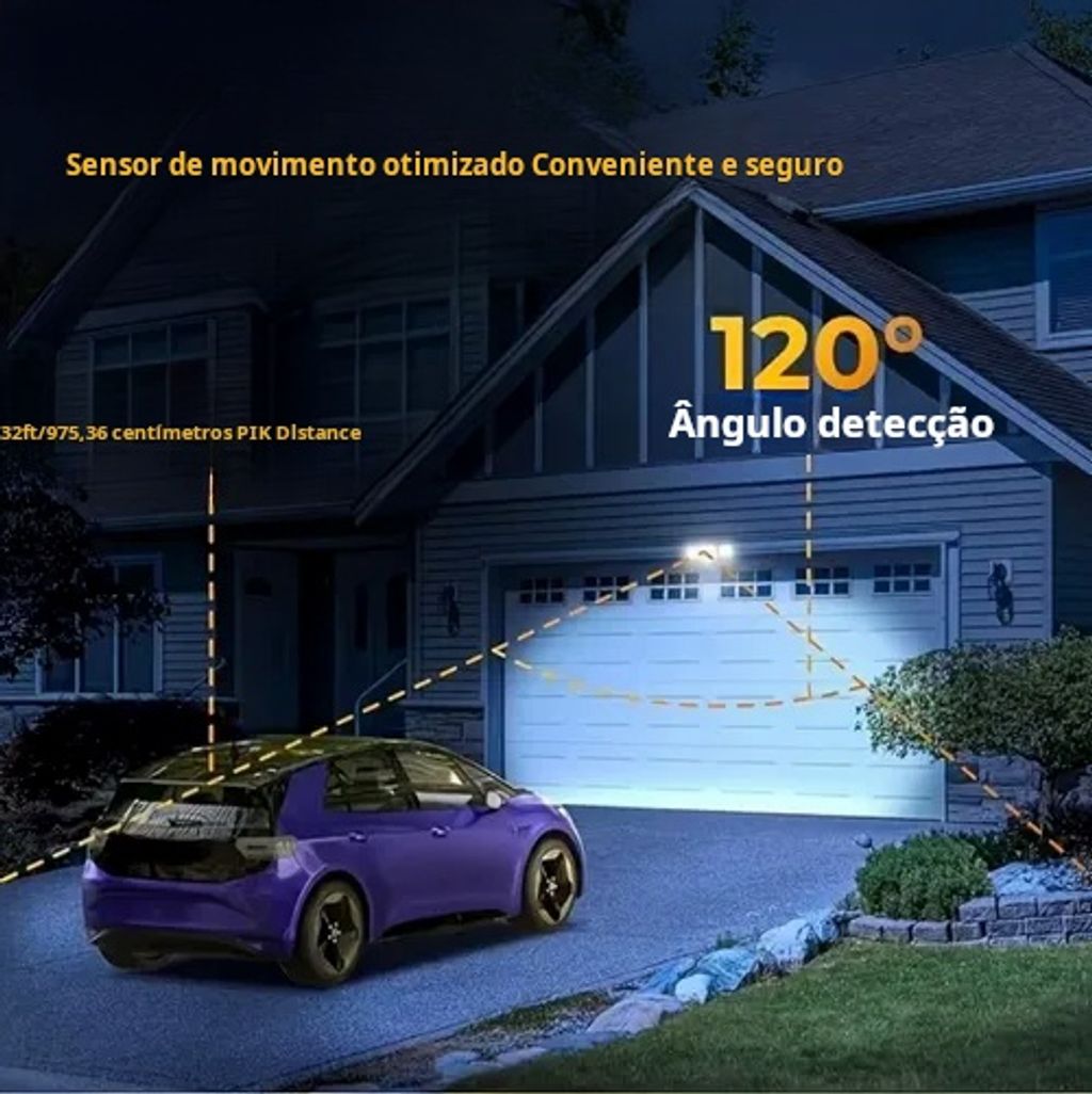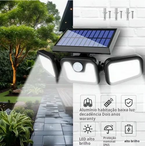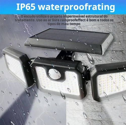 Luminária solar de segurança para exterior com 210 LEDs, 2500 lúmens, controlo remoto, 3 focos com sensor de movimento, classificação IP65 à prova de água, ângulo de iluminação amplo de 270° e 3 modos de iluminação.