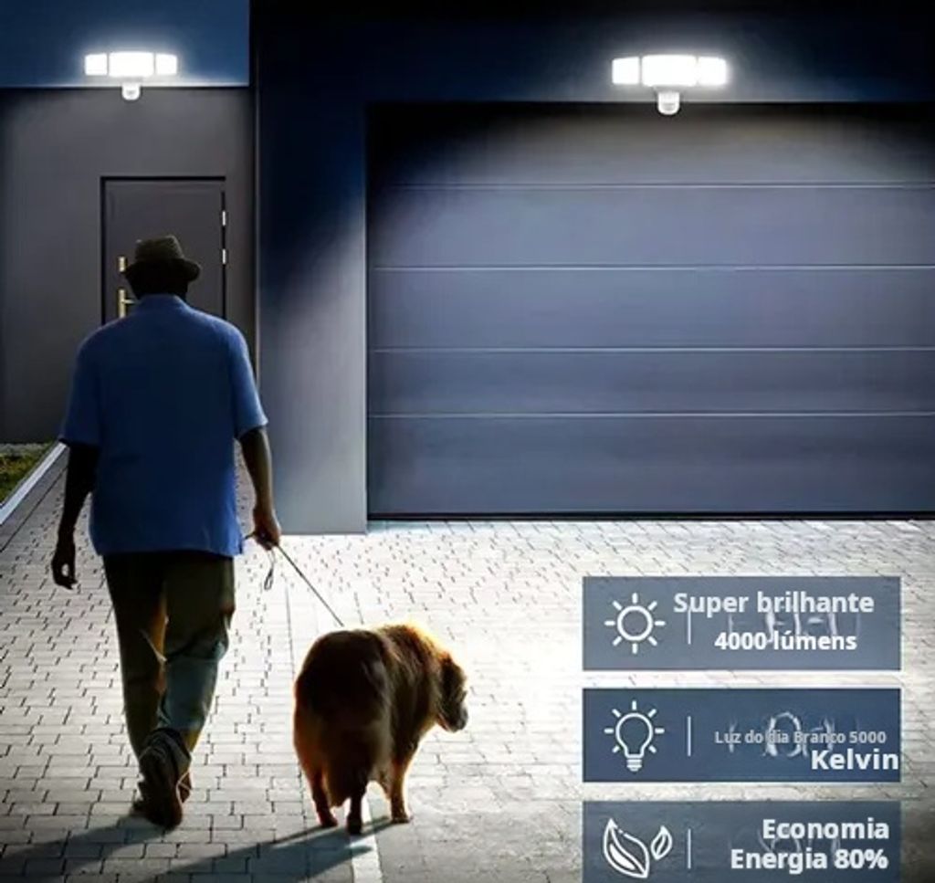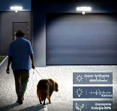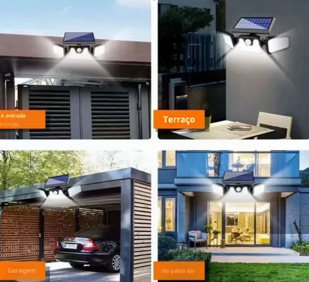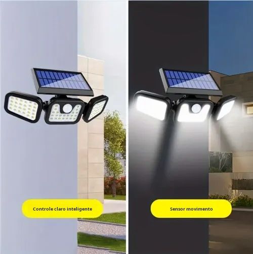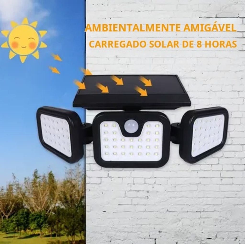 Luminária solar de segurança para exterior com 210 LEDs, 2500 lúmens, controlo remoto, 3 focos com sensor de movimento, classificação IP65 à prova de água, ângulo de iluminação amplo de 270° e 3 modos de iluminação.