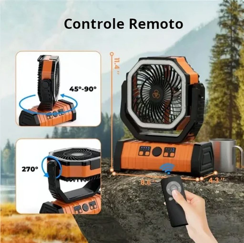 Pelo calor e pela falta de luz durante o acampamento? Este ventilador oscilante de carregamento para camping ao ar livre integra entrega potente da força do vento, iluminação LED, temporização do controle remoto e portabilidade para maior duração da bateria. É um item refrescante e indispensável para barracas, mesas e ambientes ao ar livre, tornando sua experiência de acampamento mais confortável.?? Oscilação de 270° em grande angular, cobrindo toda a área com forte força de vento