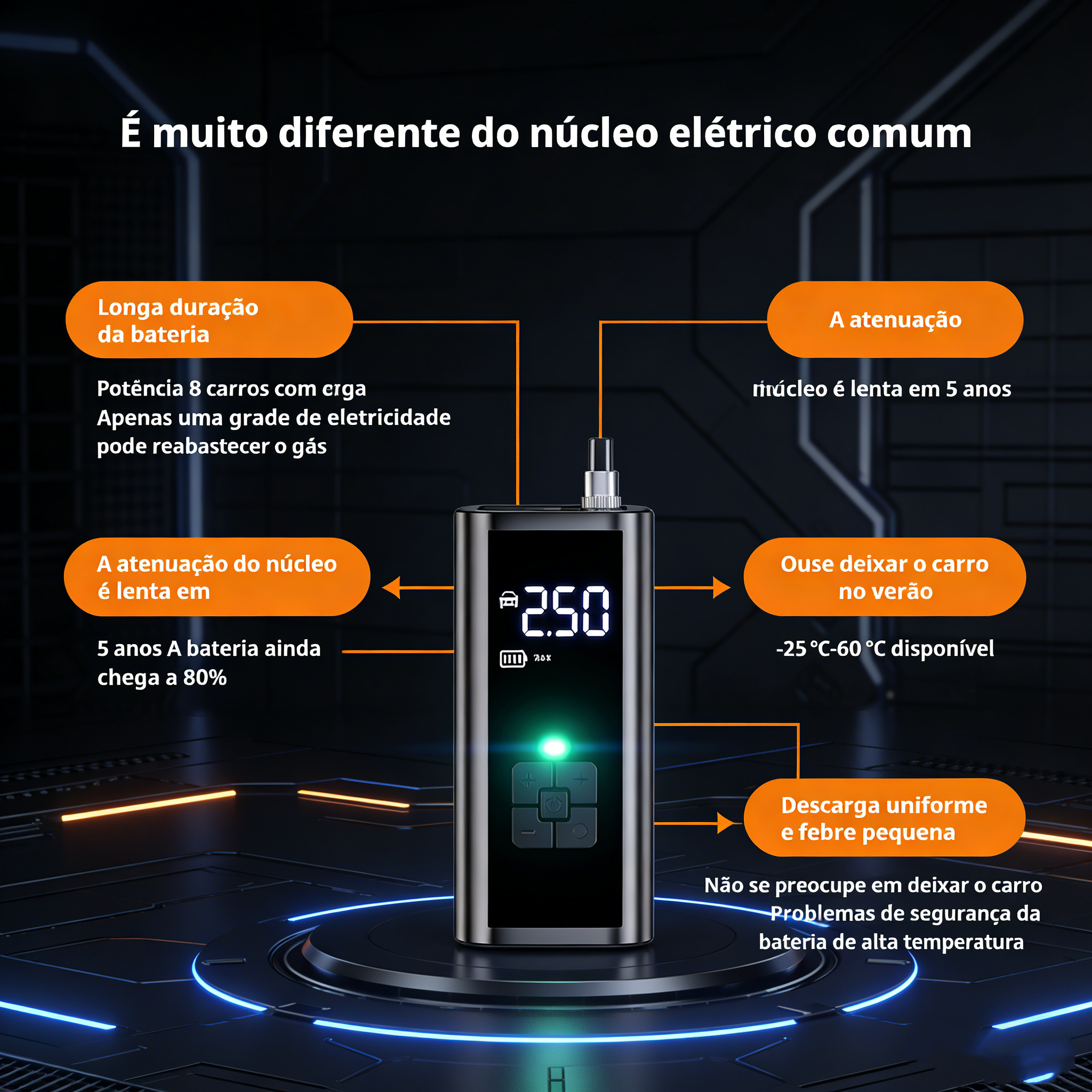 Bateria de longa duração, sempre pronto: Uma bateria integrada para veículos de alta capacidade pode encher vários pneus com uma carga completa, garantindo tranquilidade em caso de emergências durante a condução.