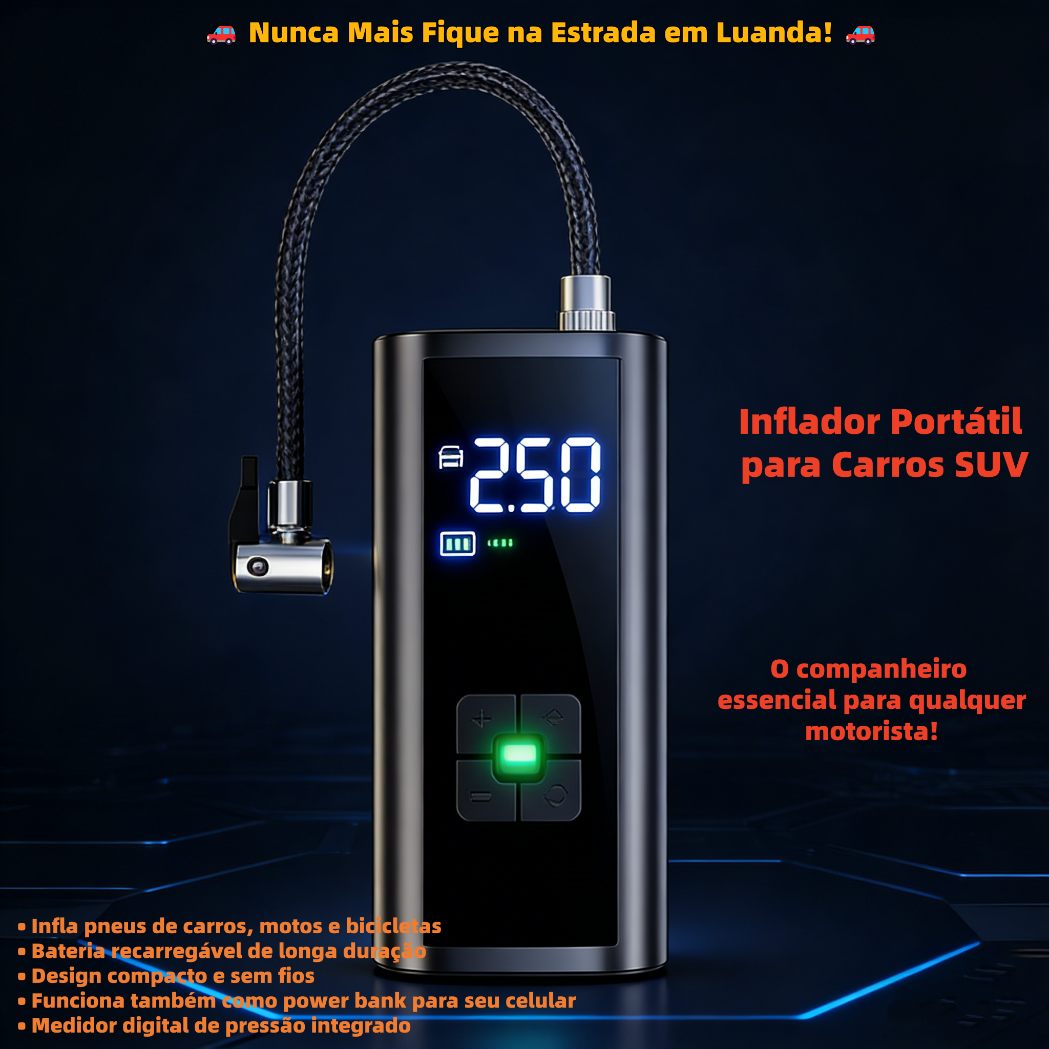 Compacto e portátil: Fácil de transportar e armazenar, ideal para encher pneus de emergência na estrada ou em casa.
